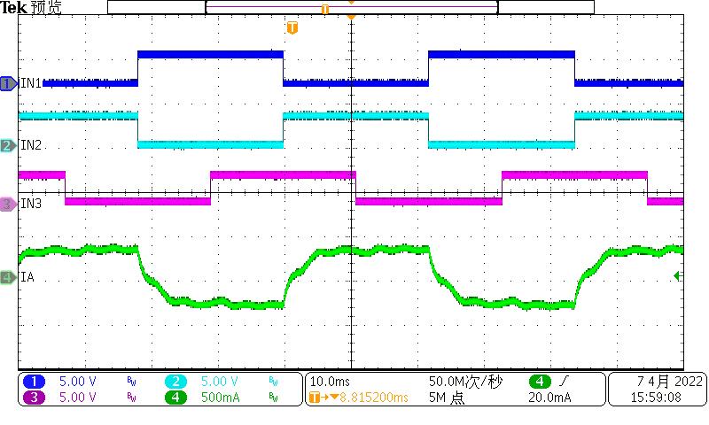 下图为2-2相励磁的实测波形,可以看出线圈电流是正负交替变化的。