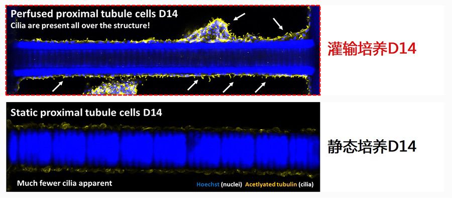 经毛细血管类器官芯片灌输培养的肾近端小管组织呈现极高的生理相似度,即肾脏细胞沿着灌输管道生长排布,纤毛选择性沿着管周生长。